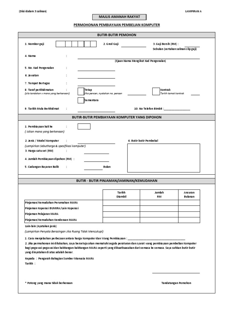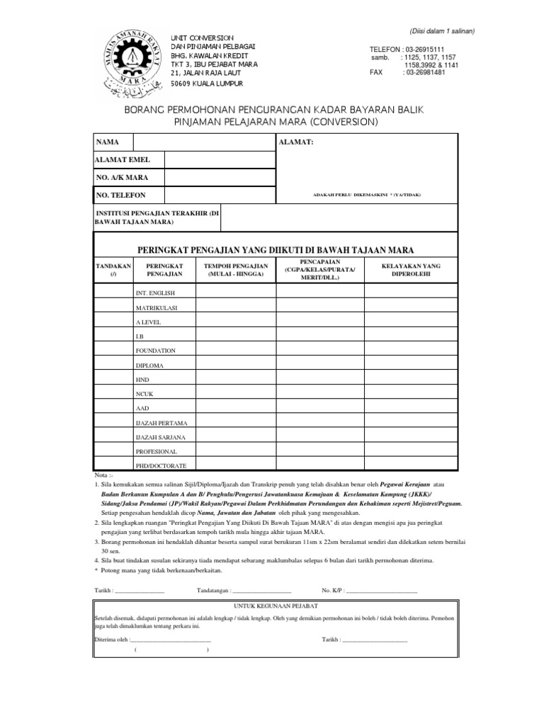 Rayuan Pinjaman Pinjaman Pelajaran Mara Vnd1q39kp9nx from idoc.pub Telah memenuhi segala syarat yang telah ditetapkan oleh mara dan exim bank. Majlis amanah rakyat (mara) menghargai privasi anda dan berusaha untuk melindungi data peribadi anda selaras dengan peruntukan akta perlindungan data peribadi 2010 (akta 709) yang telah berkuatkuasa. Sekarang semua dah canggih, semua boleh buat pengurangan secara online je tau! Pinjaman mara merangkumi skim pinjaman mikro sehingga rm10,000 untuk memulakan perniagaan dan pembiayaan sehingga rm5,000,000 bergantung kepada tahap perniagaan dan bagi lepasan ipma, permohonan boleh dihantar kepada pejabat mara daerah di mana perniagaan dijalankan. Semoga perkongsian panduan membuat permohonan pinjaman pelajaran mara bermanfaat buat semua pelajar dan ibu. Setiap pembiayaan pasti satu prosedur yang mesti dipenuhi, untuk borang permohonan skim spike. Semua maklumat yang perlu diisi dalam borang permohonan pinjaman hendaklah ditulis dengan terang menggunakan huruf besar.2. Bahkan tidak hanya untuk kpr saja, ada juga yang bisa digunakan untuk.