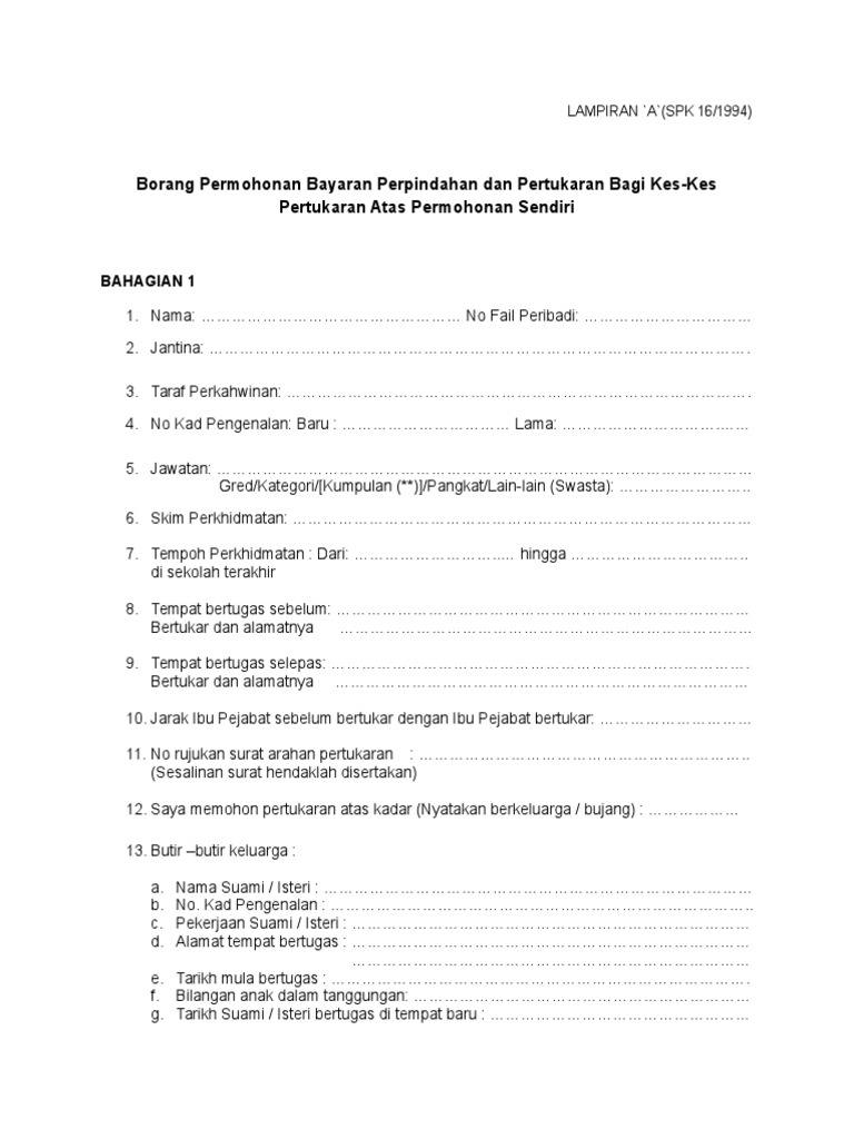 BORANG TUKAR SEKOLAH from imgv2-1-f.scribdassets.com Pemohon yang menjawat jawatan seperti berikut hendaklah mengisi borang permohonan secara manual dan. Urusan pertukaran guru tingkatan enam hanya melibatkan pertukaran ke gred jawatan yang sama dan tidak terpakai bagi penyandang kup 3. Permohonan boleh dibuat secara online melibatkan pertukaran antara bahagian / negeri, antara daerah dan dalam daerah. Permohonan pertukaran dikemukakan secara manual sama ada menggunakan borang ? Salinan borang pu(a)275 jadual 3 (diisi oleh pihak sekolah). Keputusan maklumat semakan sistem pengurusan guru terkini. Lengkapkan borang serta hantar kembali borang tersebut beserta dokumen ke sekolah semasa untuk pengesahan pengetua. Pertukaran merupakan salah satu fungsi pengurusan sumber manusia yang penting.