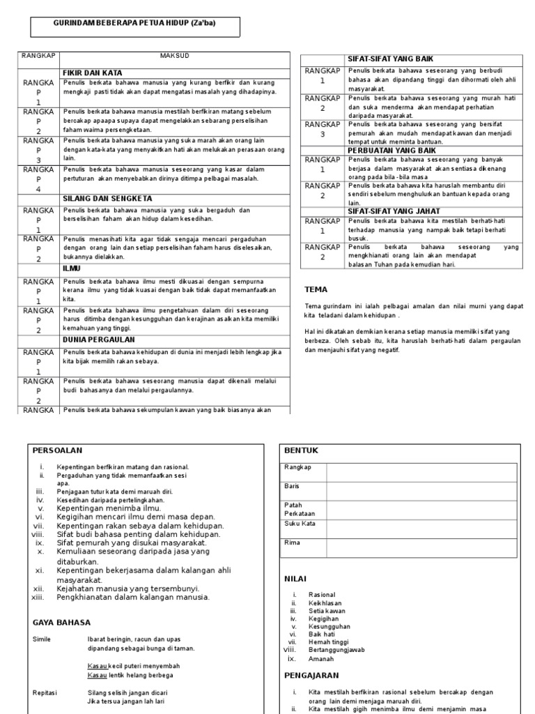 Maksud rangkap, persoalan, gaya bahasa, unsur bunyi, bentuk, nilai dan pengajaran. Gurindam adalah sajak 2 (dua) baris yang mengandung nasihat atau petuah, gurindam termasuk salah satu bentuk karya sastra lama berikut ini adalah beberapa contoh dari gurindam agama, antara lain. Barang siapa tidak takut tuhan hidupnya tidak akan bertahan. Gurindam adalah salah satu jenis puisi melayu lama yang terdiri atas dua baris dalam satu bait. Savesave latihan gurindam beberapa petua hidup for later. Latihan sajak erti hidup bererti. Fikir dahulu sebelum berkata, supaya terelak silang sengketa. Gurındam beberapa petua hıdup antologı sejadah rındu (komsas tıngkatan 5). Rangkap 2 sesiapa yang bercakap kurang sopan dan. April 4, 2017 cikgu mior. Berikut ini terdapat beberapa contoh dari gurindam, yakni sebagai berikut 100%(2)100% found this document useful (2 votes). Cara print excel tanpa terpotong.