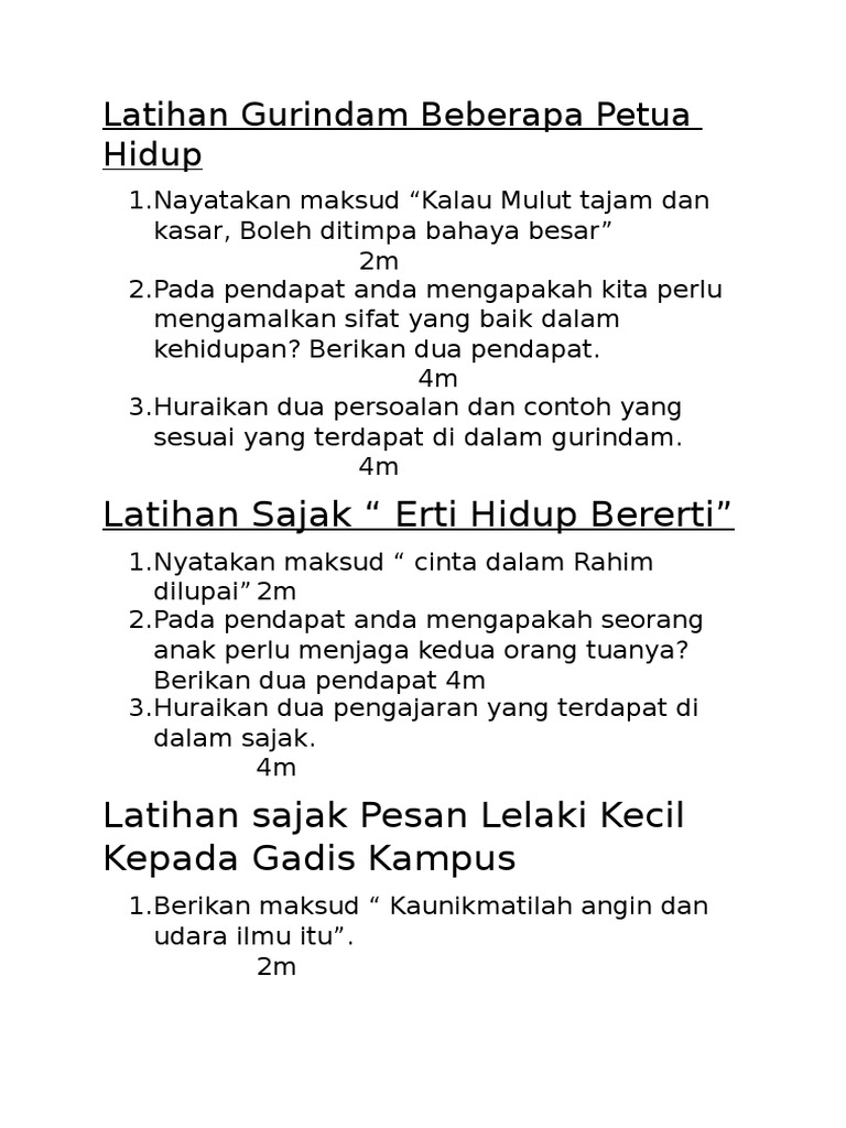 Download latihan gurindam beberapa petua hidup. Gurındam beberapa petua hıdup antologı sejadah rındu (komsas tıngkatan 5). Barang siapa tidak takut tuhan hidupnya tidak akan bertahan. 1.nyatakan maksud cinta dalam rahim dilupai 2m 2.pada pendapat anda mengapakah seorang anak perlu menjaga kedua orang. Gurindam adalah salah satu jenis puisi melayu lama yang terdiri atas dua baris dalam satu bait. Gerindam beberapa petua hidup : Didalam gurindam berisi tentang nasehat atau petuah. Seseorang yang gemar hidup bermusuh akan. Savesave latihan gurindam beberapa petua hidup for later. Gurindam mengandung amanat atau teori hidup. Gurindam adalah sajak 2 (dua) baris yang mengandung nasihat atau petuah, gurindam termasuk salah satu bentuk karya sastra lama berikut ini adalah beberapa contoh dari gurindam agama, antara lain. Maksud (komsas tingkatan 5) (za'ba). Cara print excel tanpa terpotong.